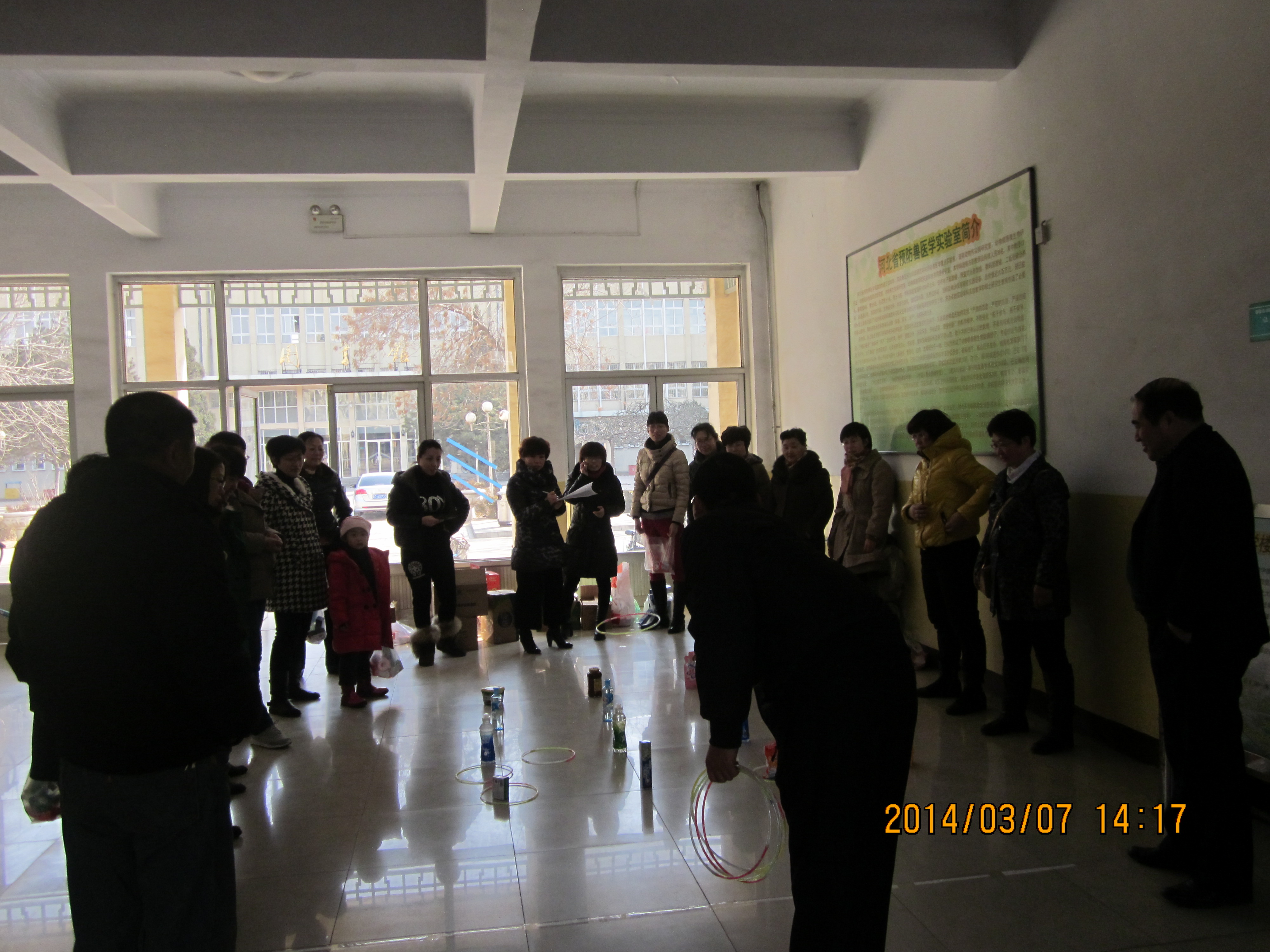 2014年3月7日beat365中国官网在动科楼一楼大厅举办了庆三八趣味套圈活动。本次套圈活动给每个教职工发放套圈的圈10个,站在套圈起止线外套,套中哪排奖品就到领奖处领取哪个等次的奖品,奖品共分为类,第一排的价值最低,难度也最低,离着起止线最近,以此类推最后一排离着起止线最远,奖品价值也最高。男教工在本次活动中参与的积极性也较高,他们的起止线比女教工远了一些,但是命中大奖率还是比较高,大家在套圈的过程中时不时发出开心得笑声,套不住的给予鼓励,套进大奖时大家齐鼓掌庆祝,气氛十分热烈,大家都开开心的度过这个三八节日,每人得到的奖品也非常丰厚,最多的能命中7圈,收获不小。