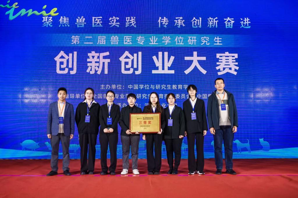 2024年11月4日至6日,第二届兽医专业学位研究生创新创业大赛在郑州举行。公司兽医专业硕士研究生刘金金、郭紫薇、王晶毅、孙莹、赵秋旖、宋乘琦等6名同学组建的“控‘蓝’有道”团队,以“猪繁殖与呼吸综合征(PRRS)RNA疫苗研发”为题参加创新组比赛,并荣获大赛团体三等奖。方玉鹏博士和刘永波博士担任大赛的指导老师。