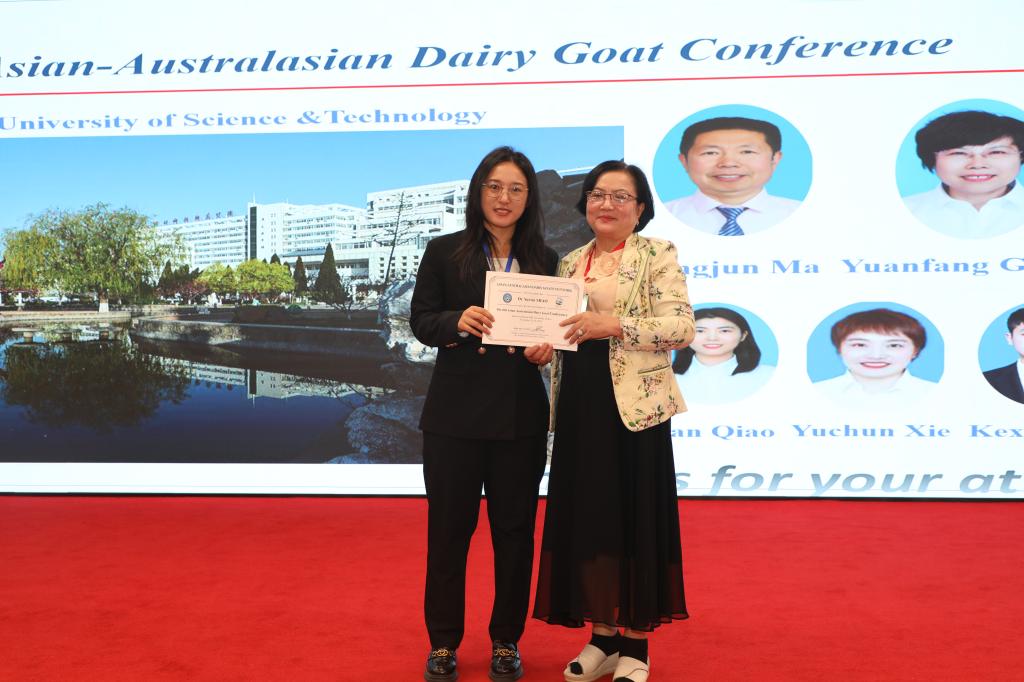 2024年11月20日到24日,由西北农林科技大学主办的“第六届亚澳奶山羊大会”于陕西杨凌召开。来自全球10个国家的170多位专家学者、企业行业代表参会,共同探讨奶山羊产业的最新研究成果和未来发展方向。本届论坛的主题是“奶山羊绿色养殖与优质羊奶生产”。beat365中国官网青年教师邵钺馨博士参加论坛并作“Function and regulation mechanism of CTCF on lactoferrin synthesis in dairy goat”大会报告。