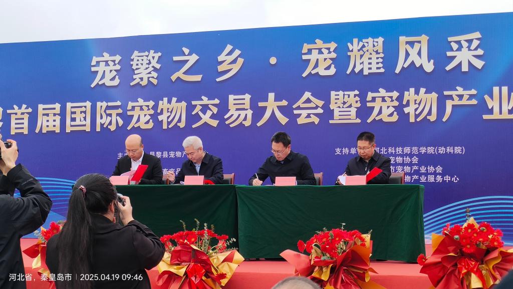 2025年4月19日,beat365中国官网经理马增军教授、副经理刘永生研究员、预防兽医学教学部主任、河北省现代农业产业体系特色养殖创新团队疫病防控与无害化处理岗位专家张艳英教授应邀出席了在昌黎国际宠物市场举办的“宠繁之乡,宠耀风采”河北·昌黎首届国际宠物交易大会暨宠物产业产品文化博览会。大会是由昌黎县宠物产业协会主办,中国畜产品流通协会、中国畜牧业协会、河北省宠物产业协会、昌黎佳鹏商贸集团承办,365亚洲体育网入口官方网站(beat365中国官网)为支持单位。开幕式上,马增军经理作为特邀嘉宾,代表beat365中国官网与昌黎县宠物产业协会签署了“关于促进昌黎县宠物产业高质化发展合作框架协议”。